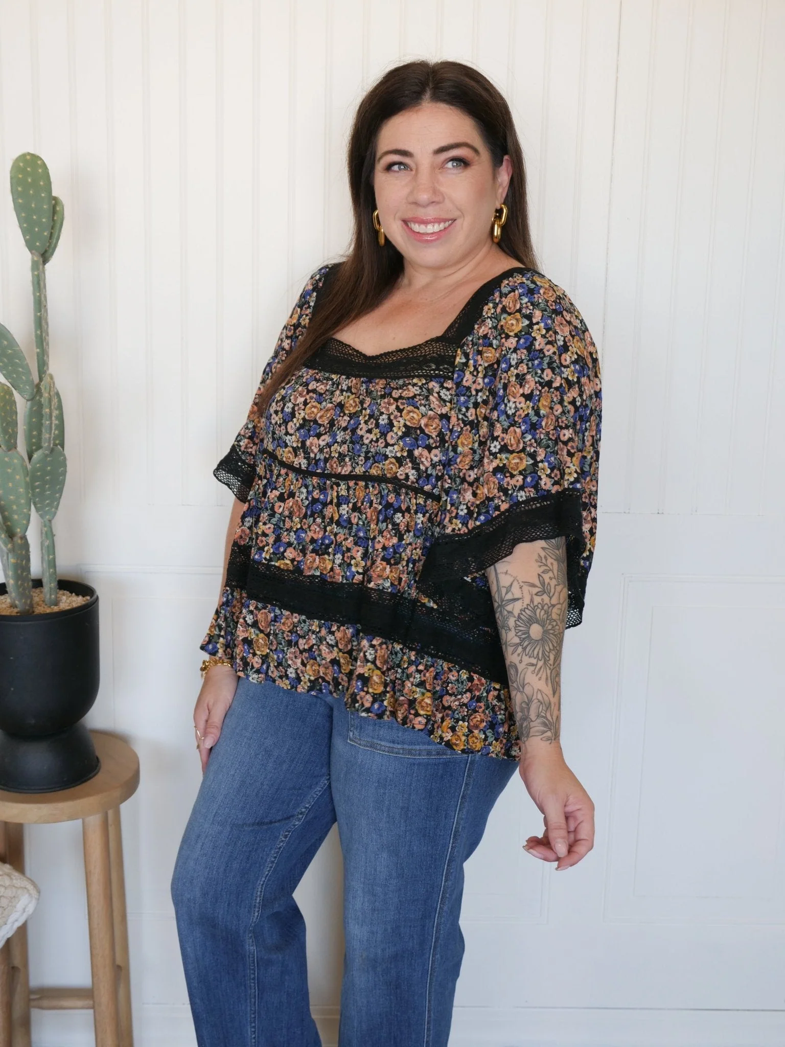 A little romantic, a little playful—this floral lace-trim blouse is what happens when comfy meets charming.