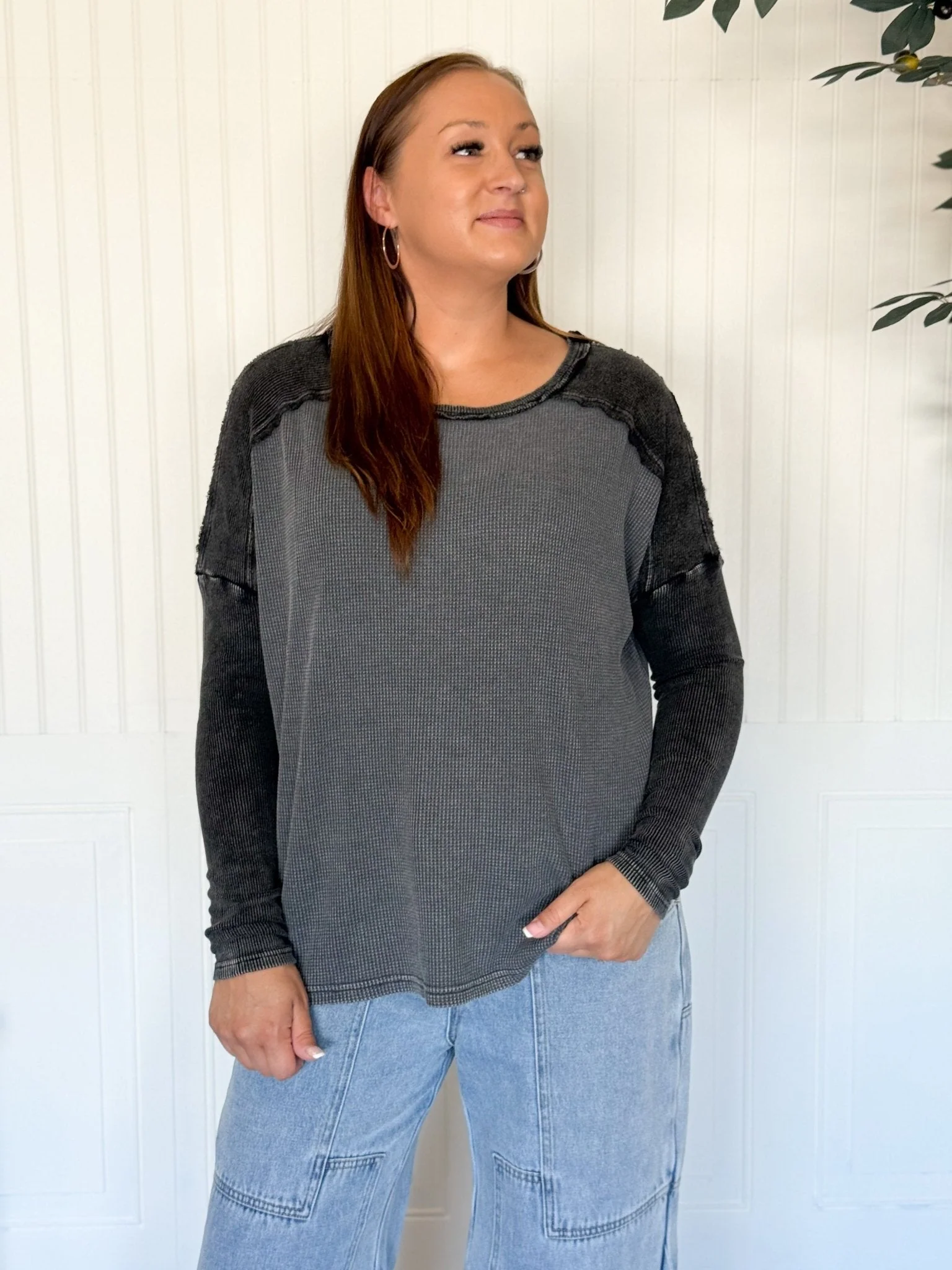 This is that cozy, lived-in thermal you’ll want to throw on for everything from early morning coffee runs to lazy evenings on the porch. The mineral wash gives it that perfectly faded, slightly edgy vibe—like you’ve had it forever (but in the best way). It’s lightweight yet warm, and the textured knit drapes just right for those casual, comfy days.